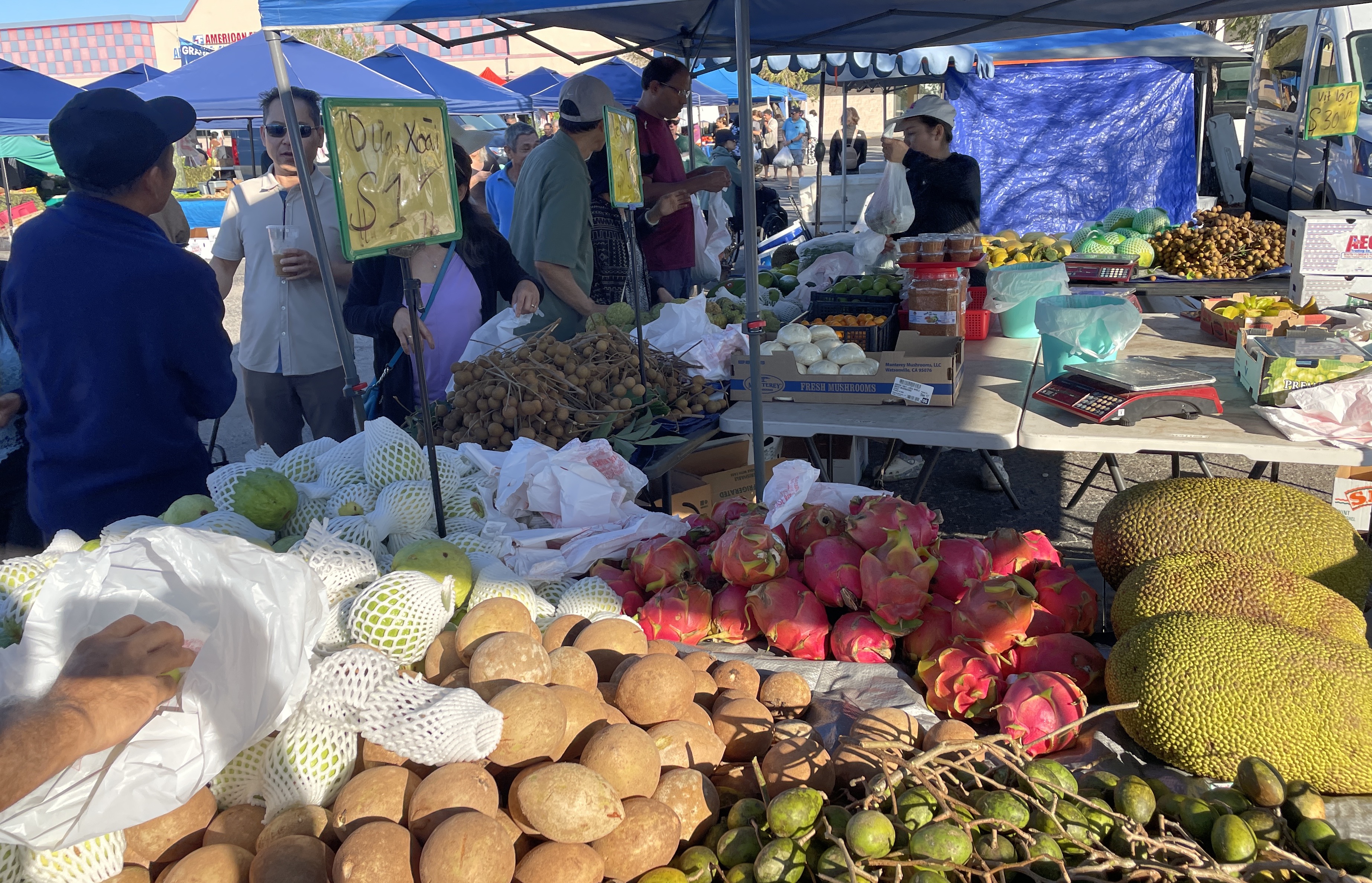 Những ngày ở đây chúng tôi đi chợ trời cuối tuần, có hàng quán bán cháo lòng, bún mắm, nước mía. Cuối tháng 12 dương lịch mà có nhiều trái cây quê nhà như na, sapôchê, mít, vú sữa, ô ma, nhãn, xoài, ổi, cóc, khế; các loại rau muống, rau mồng tơi, rau dền, mướp hương. Rau tương đối rẻ còn trái cây nếu so với California thì không. Sapôchê, nhãn 5 đô một cân Anh, na nhỏ 8 đô, na lớn 15 đô một cân, vú sữa hai trái 8 đô 50 xu. Cây me non, cao chừng một mét có người mua với giá 40 đô.