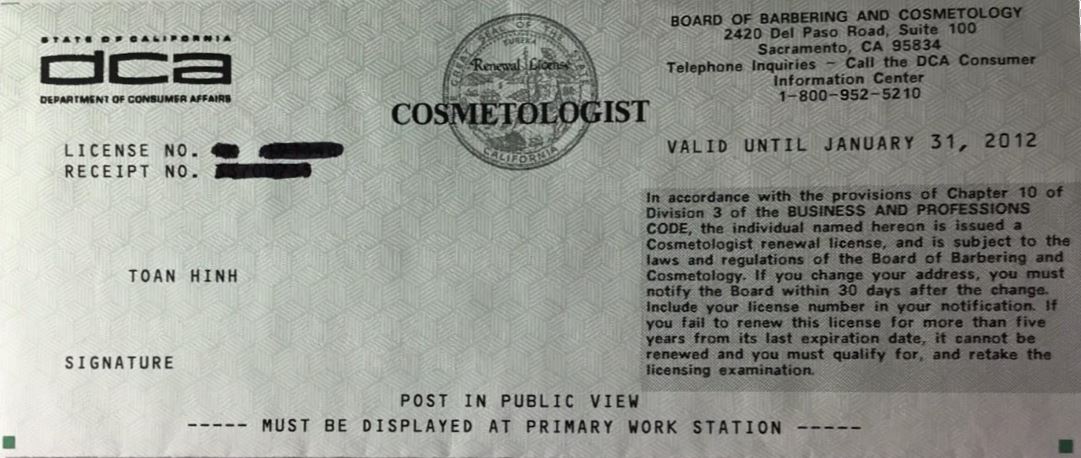 Bằng hành nghề uốn tóc, móng tay của Hình Toàn |